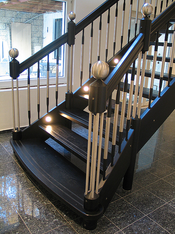 Die Kombination der Materialien verleiht der Treppe eine harmonische Balance zwischen natürlicher Wärme und glänzender Raffinesse.